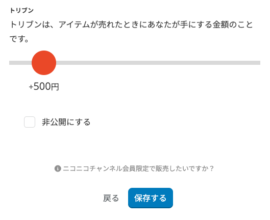 トリブンはアイテムの販売価格から原価を引いた金額で、クリエイターの利益となる。100円に設定してもいいし、強気の5,000円でもいい。0円(無料)で設定することも可能。また、トリブンを1回の受け取りごとに振込手数料176円がかかる。